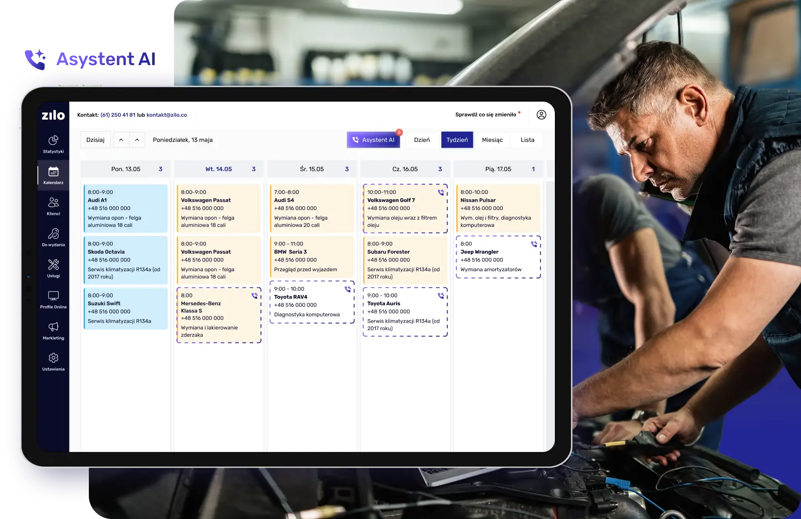 Wygodny terminarz warsztatu i baza klientów, które uzupełniają się automatycznie podczas rozmów z klientami. Oszczędzaj czas i miej wszystkie informacje zapisane w jednym miejscu.