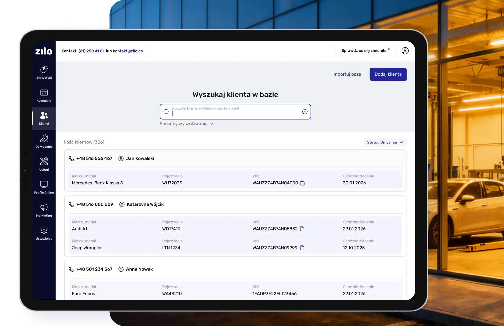 Zilo automatycznie buduje bazę klientów i zapisuje historię napraw, dzięki czemu wszystko masz zawsze pod ręką.