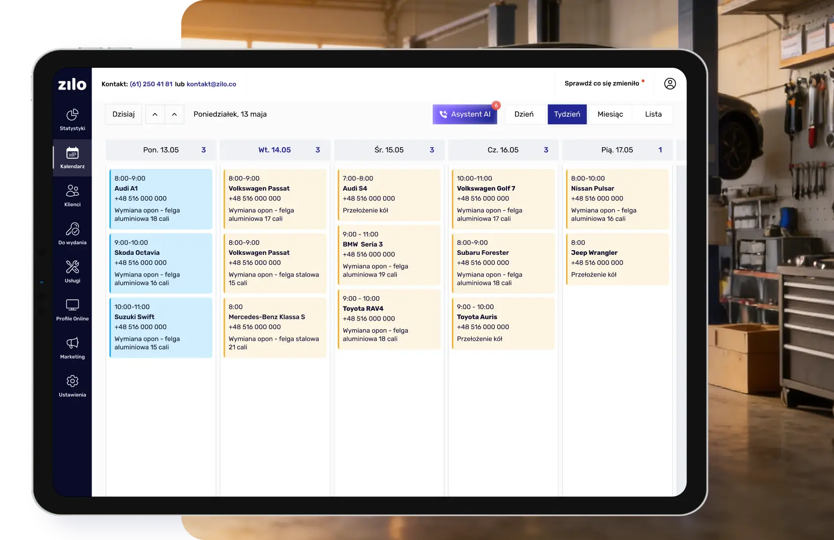 Terminarz w Zilo pozwala łatwo planować pracę i sprawdzać dostępne terminy. Widoki dzienne, tygodniowe i miesięczne dają szybki podgląd na bieżące zlecenia i plan na kolejne dni.