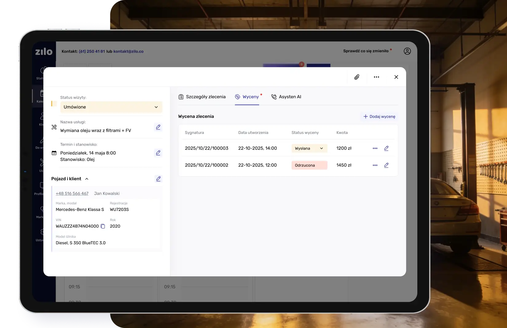 W Zilo tworzysz wycenę bezpośrednio ze zlecenia, dodając usługi, części i materiały w jednym miejscu. Wszystko zapisuje się automatycznie.